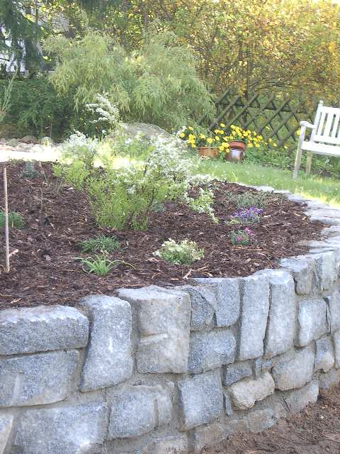 Granitmauer mit Polstestauden als Randbepflanzung.